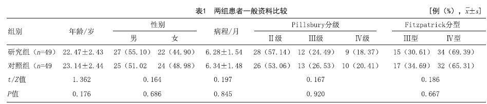 [摘要]目的:探讨非剥脱性点阵激光联合口服多西环素治疗中度寻常痤疮的有效性及安全性。方法:选取2020年1月-2021年12月笔者医院收治的98例中度寻常痤疮患者为研究对象,采用随机数字表法分为研究组和对照组,每组49例。对照组口服盐酸多西环素片,研究组在对照组的基础上联合1 565 nm非剥脱性点阵激光进行治疗。(剩余9489字)
