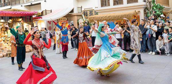 9月6日,演员在新疆国际大巴扎景区为游客表演舞蹈。(孙振嵩/人民图片)
