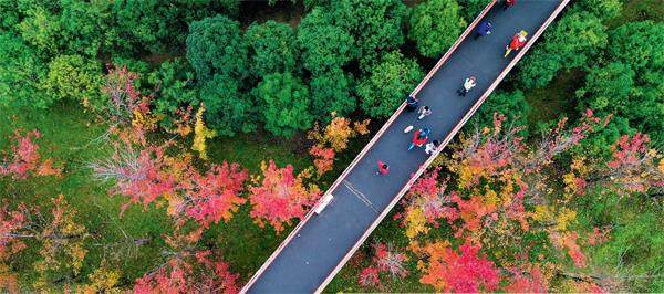陕西省西安市雁塔区持续改善生态环境。图为10月25日,雁南公园层林尽染,吸引游客前来休闲游玩。(薛刚/人民图片)