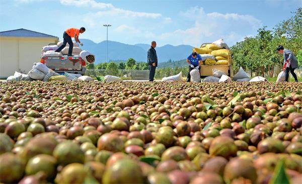 湖南永顺县石堤镇狮子村,村民将刚采摘的油茶鲜果送往加工点。