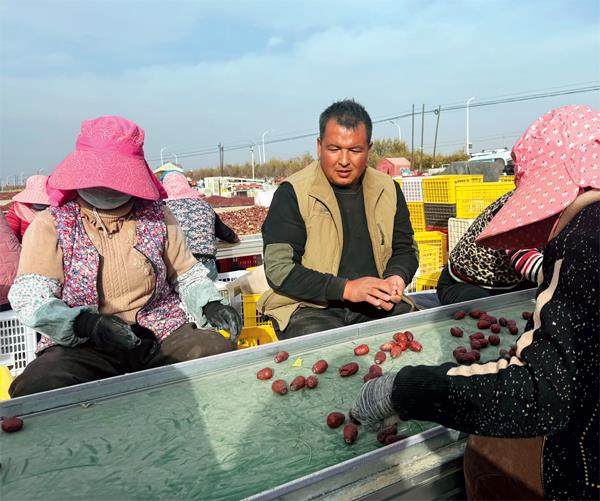阿卜杜拉·亚库普(中)与村民在筛选红枣。
