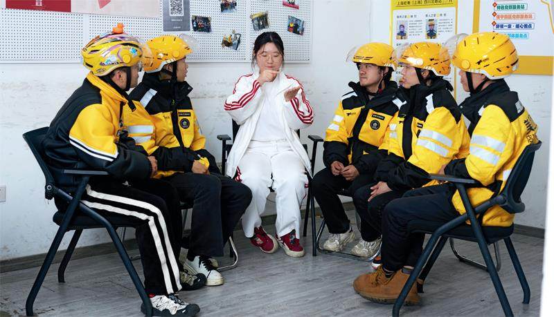 手语老师顾心如和听障骑手孙精精(右二)、杨浩兵(左一)等一起交流。