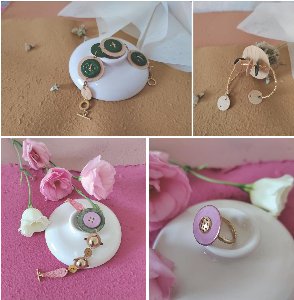 该首饰设计作品采用紫铜圆胎作为底面,在其中间位置进行钻孔以还原纽扣的形态,然后将珐琅釉料以干筛的方式纯色高温正常烧制而成。作品将竹片、皮革、铜丝与其结合进行设计创作,不同材料的碰撞与色彩的搭配展现首饰整体温润自然和复古优雅的风格。(剩余156字)