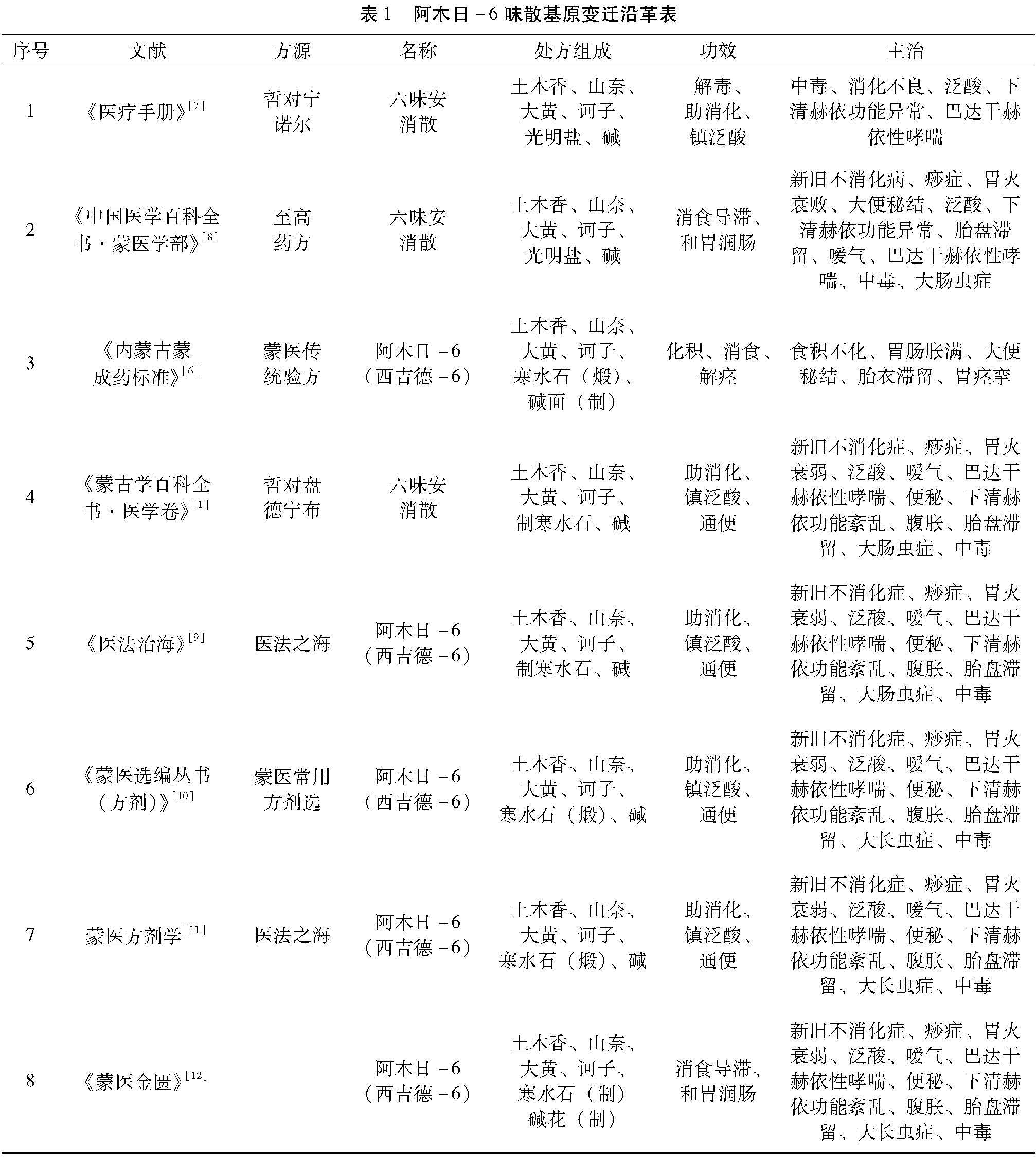 【摘 要】阿木日-6味散出自《医法之海》,属于蒙古族与藏族的传统验方,其蒙文名为阿木日-6,别名为西吉德-6,别名为六味阿毛尔散,由藏木香、大黄、山柰、北寒水石(煅)、诃子、碱花等蒙药按照比例配伍组成,具有和胃健脾、消积导滞、活血止痛等功效,蒙医中用于治疗脾胃不和、积滞内停所致的胃痛胀满、消化不良、便秘、痛经、高血脂症等。(剩余6258字)