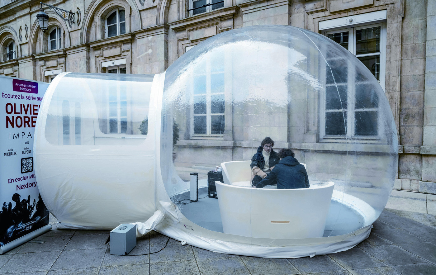 2022年4月3日,法国里昂,第18届国际侦探小说节,参与者坐在塑料泡泡里听有声书