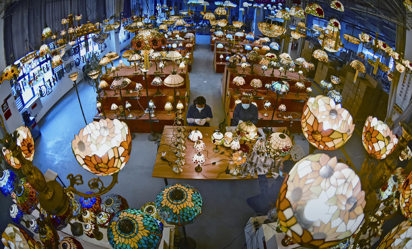 2022年4月14日,江苏连云港市,工人在组装一批销往海外的彩色玻璃工艺台灯