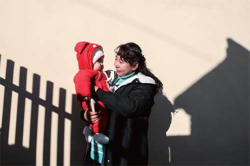 2025年12月2 9日,甘肃榆中,村民抱着孙子在马坡乡马莲滩村集中安置点的新家晒太阳(图/新华社)