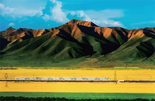 兰新高铁列车穿行在青海门源回族自治县百里油菜花海间