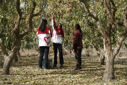 2024年10月22日,新疆阿拉尔,两名西部计划志愿者正在帮枣农摘枣