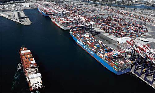 2025年4月3日,美国加州,中远海运的集装箱船停靠在长滩港