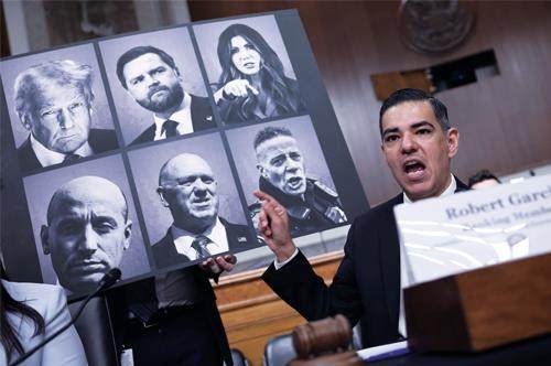 2026年2月3日,美国众议员罗伯特·加西亚在一场听证会上发言,展板上显示联邦特工暴力执法事件的相关负责人