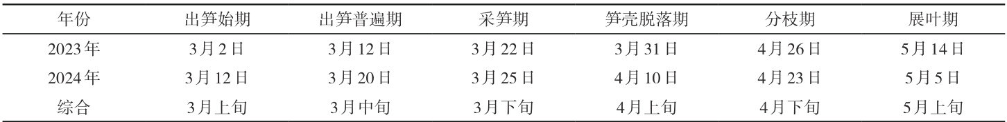摘 要:2023年3月—2024年7月对大关县筇竹竹笋—幼竹开展为期2年的物候期、笋高生长量的动态研究和调查,并分析了影响笋高生长量的气象因子及各物候期气候特征。结果表明:筇竹可当年完成高生长,全高可达 400cm 以上;笋期主要集中在3—4月,4月上中旬进入笋壳脱落期,到4月下旬进入分枝期,竹笋5月上旬进入展叶期,形成新竹;笋高生长量呈“慢—快—慢”的“S”形趋势分布,出笋后的30~35 d达到生长速率高峰期;筇竹高生长量与温度和湿度有显著相关性,其中温度主要是气温日较差起主导作用;筇竹出笋期与 ⩾10∘C 的气候生长期开始时间几乎同步,可用气候生长期来推测筇竹出笋期。(剩余3333字)