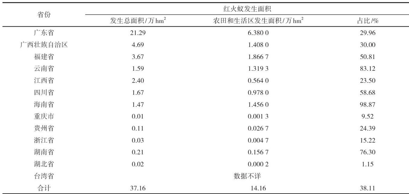红火蚁被列为世界最危险的100种入侵生物之一,同时也是我国进境及农林业植物检疫认定的有害生物[1]。据2023年10月全国农业植物疫情监测网的数据,红火蚁的发生面积已达41.53万 hm2 ,广泛分布于我国13个省(自治区、直辖市)的642个县(市、区)[2]。(剩余2506字)