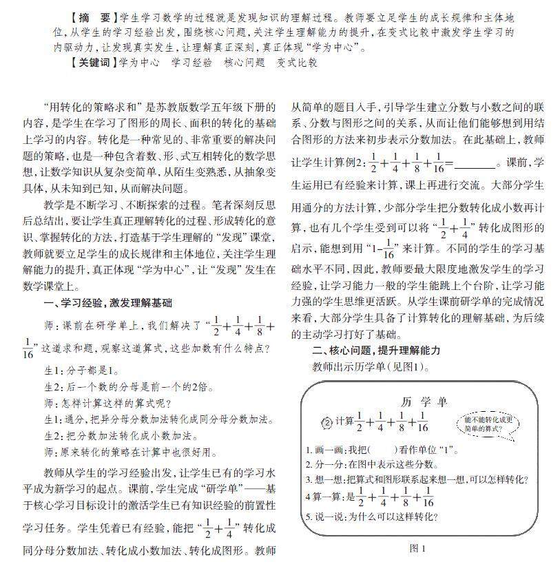 【摘 要】学生学习数学的过程就是发现知识的理解过程。教师要立足学生的成长规律和主体地位,从学生的学习经验出发,围绕核心问题,关注学生理解能力的提升,在变式比较中激发学生学习的内驱动力,让发现真实发生,让理解真正深刻,真正体现“学为中心”。