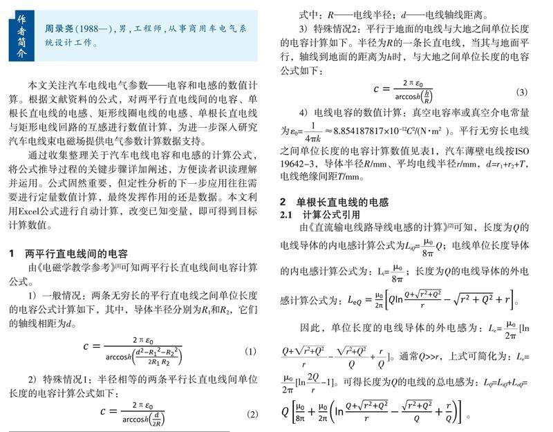 【摘 要】汽车电线的电容和电感是汽车电线束电磁兼容分析计算的重要基础参数,本文通过整理计算公式,给出数值计算示例,方便查表并快速应用。