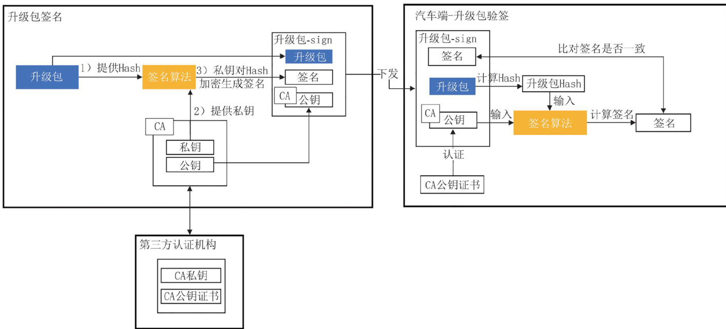 【Abstract】With the development of the "new four modernizations" of automobiles,automotive software is updated and iterated frequently.The traditionalofline upgrade function can no longer meet the needs of users and automakers.Therefore,itis necessary todevelop theover-the-air (OTA)upgrade function forautomobiles.Through OTA upgrades,car manufacturers can push new features to vehicles in real time and continuouslyoptimize the user product experience.However,the OTA upgrade processinvolves data interaction among multiple links such as the vehicle end, cloud,andcommunicationlinks,exposingthevehicletotheriskofcyberatacks.Thisarticlesystematicallyintroduces theinformation security response solutions in the development of OTA functions for commercial vehicles from four dimensions: upgrade package security,vehicle-cloud link security,vehicle-end secure storage,and security monitoring and emergency response,providing technical references forthe secure implementationof OTA incommercial vehicles.