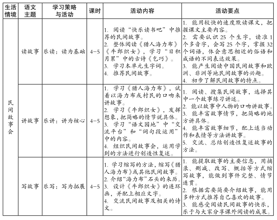 针对教材五年级上册的“民间故事”单元,在对单元内容的结构、目标和任务准确把握的前提下,我们该如何落实学科育人精神,探索文学阅读与创意表达任务群教学活动,激发学生参与的积极性,并在真实情境中,带领学生带着任务走进民间故事,去品味语言,欣赏艺术形象,积累情感,从而提升言语能力呢?