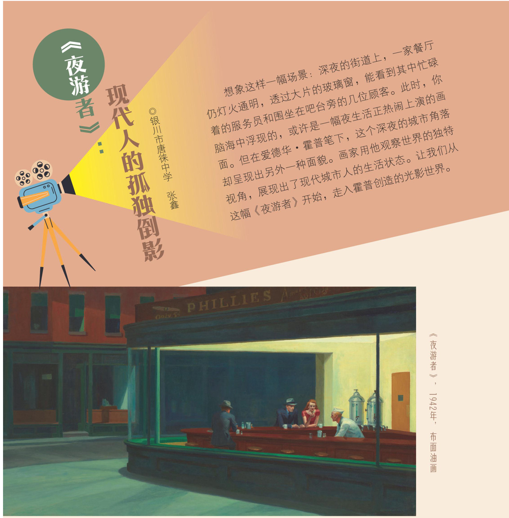 《夜游者》(Nighthawks,又译《夜鹰》)是美国现实主义画家创作于1942年的一幅布面油画,也是他最负盛名的画作之一。画家通过独特的色彩与笔触,创设出一个极具张力的艺术空间,为巨大的沉默所笼罩的画面,给观者带来强烈的视觉冲击,使观者体味到某种现代人共有的孤独