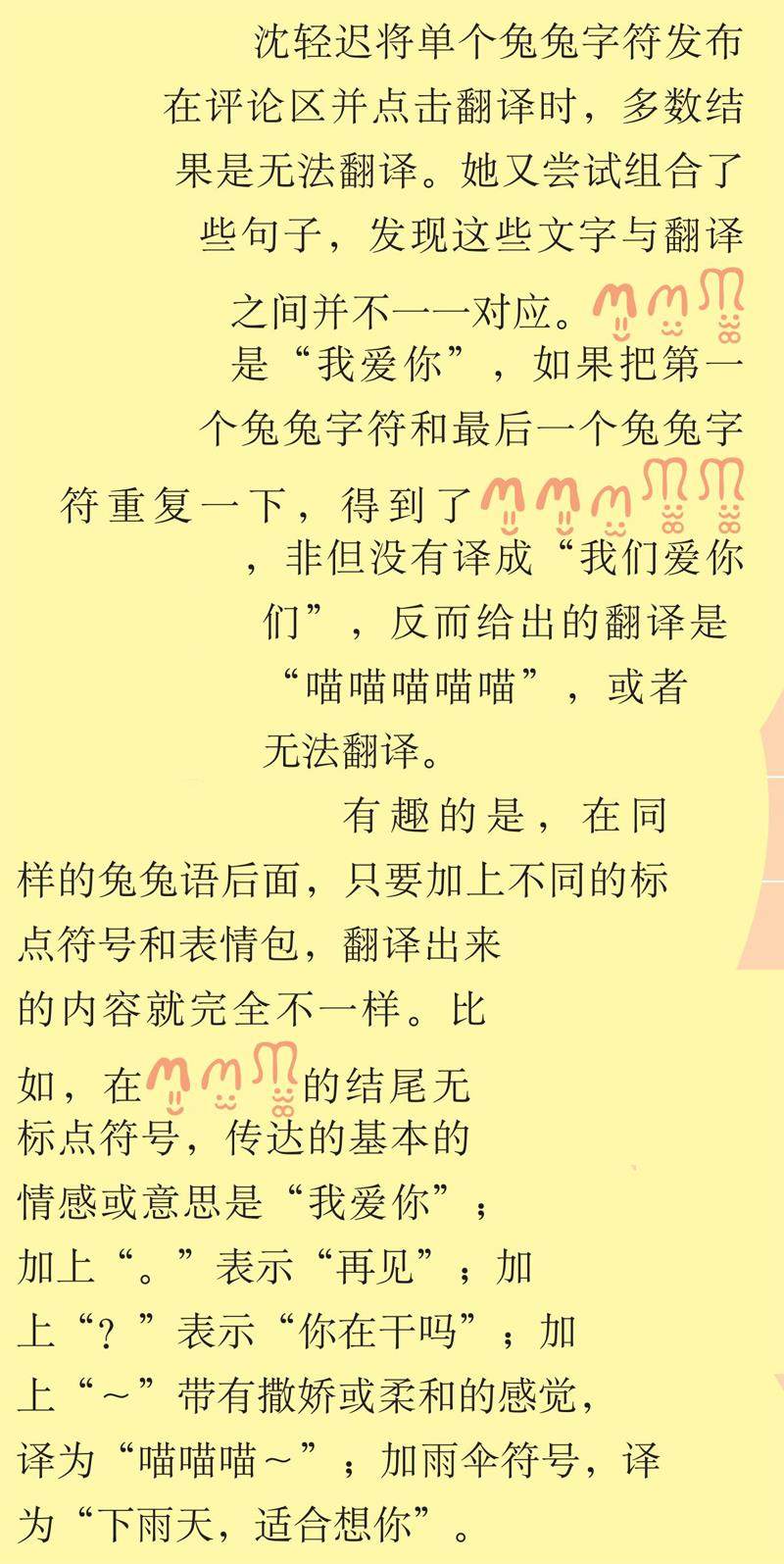 兔兔文在中文社交圈走红,源于一次误打误撞。杭州小红书博主@沈轻迟喜欢在评论区留言,一次,她突发奇想,在小红书评论区里用输入法胡乱打了几个可爱的“颜文字”。(剩余702字)