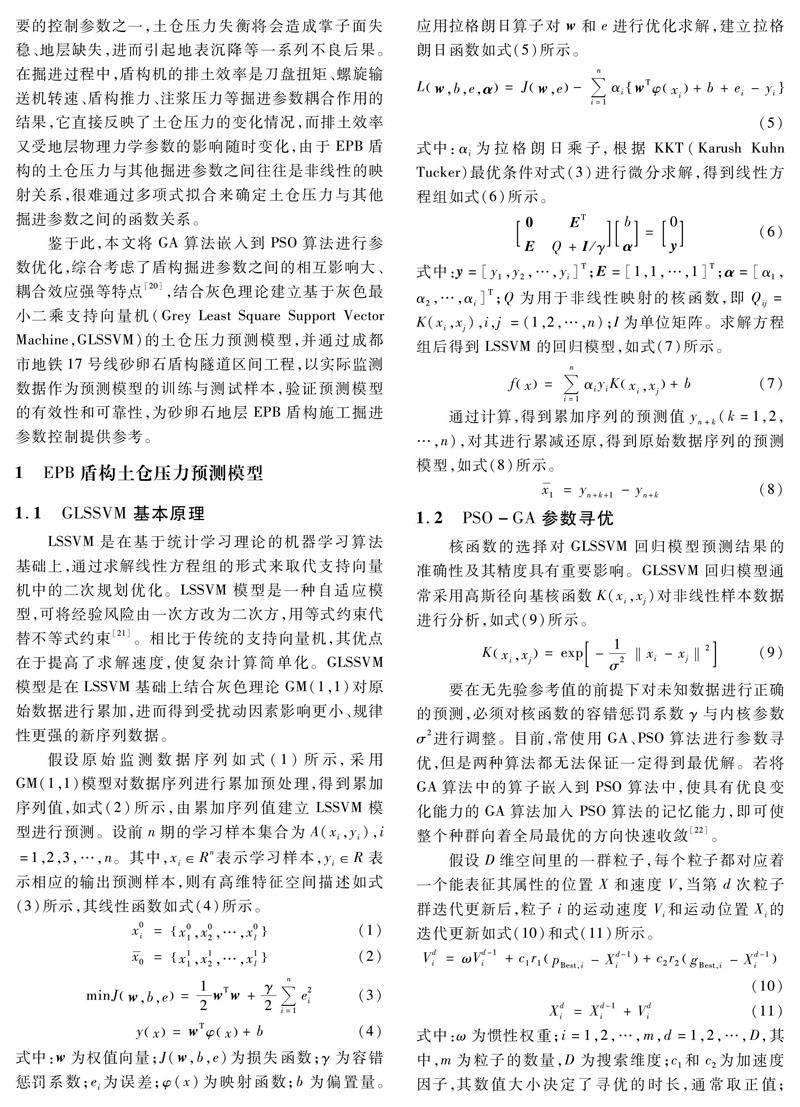 摘要:为了避免因土压平衡盾构(EPB)土仓压力失衡造成的掌子面失稳、地层缺失和地表沉降等后果,将GA算法嵌入到PSO算法进行参数优化,结合灰色理论建立基于灰色最小二乘支持向量机的土仓压力预测模型,并以实际工程为案例进行了验证。研究结果表明:GA-PSO-GLSSVM土仓压力预测模型将总推力、刀盘扭矩、推进速度、螺旋机转速、螺旋机扭矩、注浆量6种掘进参数作为输入集,综合考虑了盾构掘进参数之间的相互影响,使预测模型更符合实际;该预测模型综合了GA算法的全局搜索能力、PSO算法的快速收敛能力和GM模型抗扰动能力,提高了复杂地层EPB土仓压力预测的精度;与其他预测模型预测结果的对比表明,GA-PSO-GLSSVM模型预测结果的均方根误差(RMSE)、平均绝对误差(MAE)、平均绝对百分比误差(MAPE)、可决系数(R2)明显优于其他模型,预测结果拟合优度和精确度更高,对砂卵石这类复杂地层中EPB盾构土仓压力的预测具有显著的适用性。(剩余10101字)