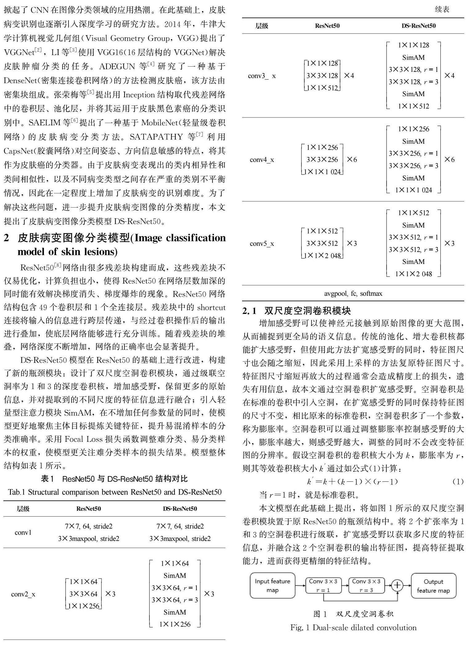 摘 要:为解决皮肤科医生人工识别皮肤癌过程中存在效率低、劳动强度大等问题,提出一种皮肤病变图像分类模型DS-ResNet50。该模型在ResNet50(深度残差网络)的基础上进行改进:设计了双尺度空洞卷积模块,通过级联不同空洞率的深度卷积核提取不同尺度的特征信息并进行融合;引入轻量型注意力模块SimAM,使模型更好地聚焦主体目标提炼关键特征。(剩余6801字)