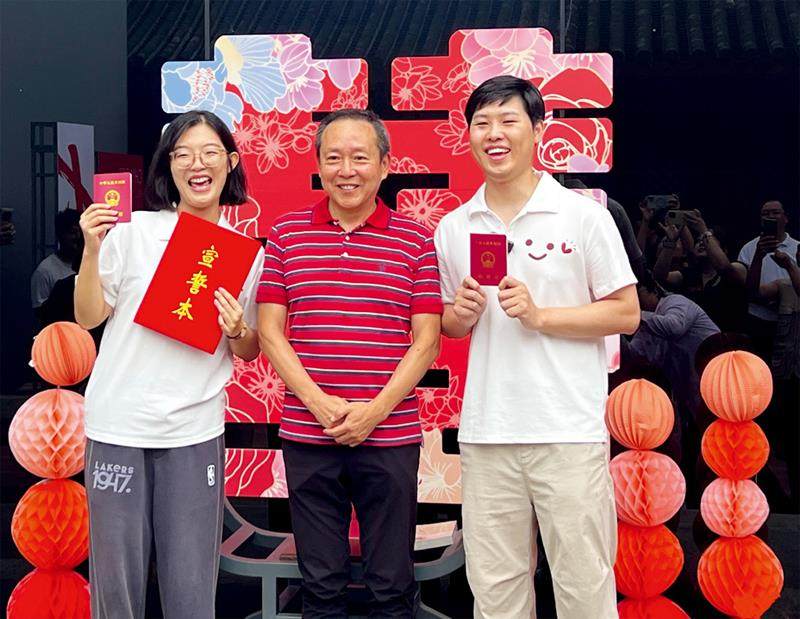 沈清(中)为新人颁发结婚证。本刊记者 赵丽岳摄
