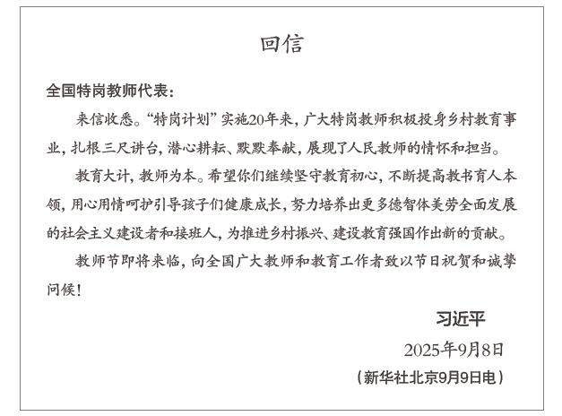中央总书记、国家主席、中央军委主席习近平给全国特岗教师代表回信,提出殷切希望,并向全国广大教师和教育工作者致以节日祝贺和诚挚问候。
