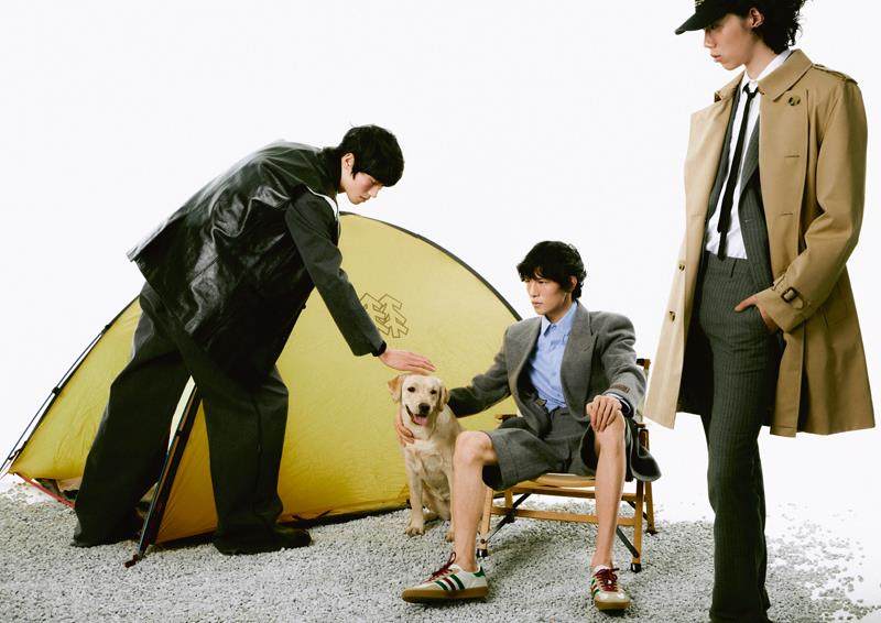 · 李心一 黄色风衣和黑色Logo棒球帽均为Burberry灰色条纹西装上衣、白色衬衫、灰色条纹西装长裤、黑色皮靴和领带均为Celine by Hedi Slimane陨石帐和露营椅 均为Kolon Sport