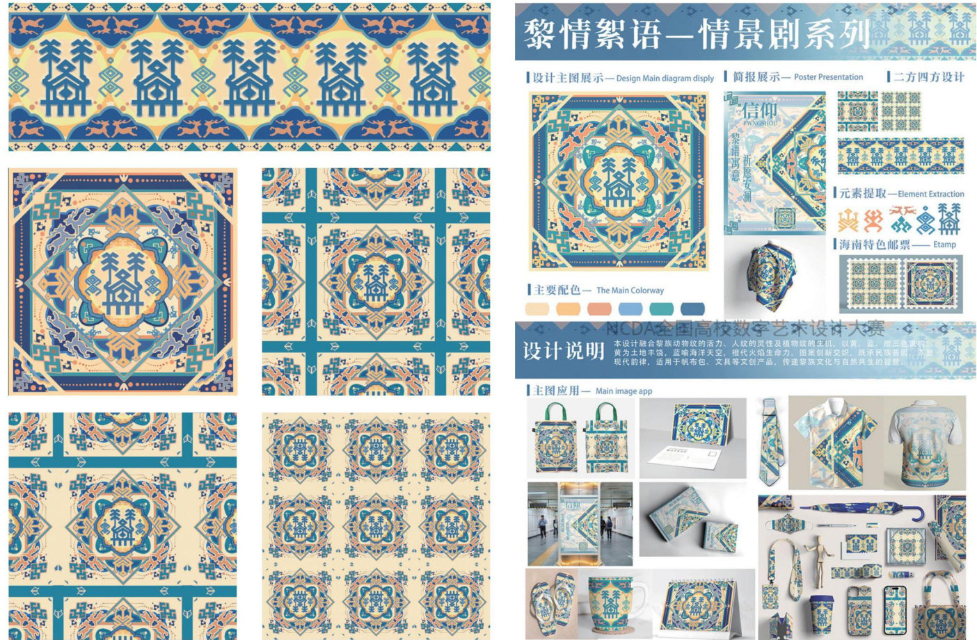 本设计提取黎族动物纹样精髓,进行几何化、韵律感重构。主色调选用黄(象征海南阳光与传统)、蓝(寓意海洋与智慧)、紫(代表神秘与信仰)应用于家纺此创新纹样(如床品靠垫、桌旗、窗帘等)而打造。旨在将黎族深厚的文化底蕴巧妙融入现代家居生活,通过织物载体展现民族艺术的魅力,以现代手法演绎民族文化,赋予织物灵动活力与独特艺术气质,兼具装饰性与舒适感。(剩余325字)