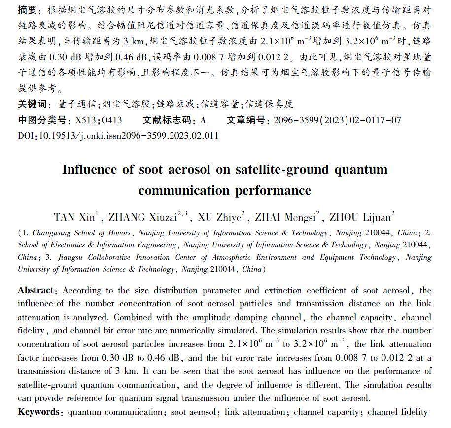 摘要:根据烟尘气溶胶的尺寸分布参数和消光系数,分析了烟尘气溶胶粒子数浓度与传输距离对链路衰减的影响。结合幅值阻尼信道对信道容量、信道保真度及信道误码率进行数值仿真。仿真结果表明,当传输距离为3 km,烟尘气溶胶粒子数浓度由2.1×106 m-3增加到3.2×106 m-3时,链路衰减由0.3 dB增加到0.46 dB,误码率由0.008 7增加到0.012 2。(剩余9599字)
