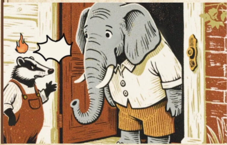 听了獾先生的故事,大象赶紧回家,写了一篇关于獾先生的文章。