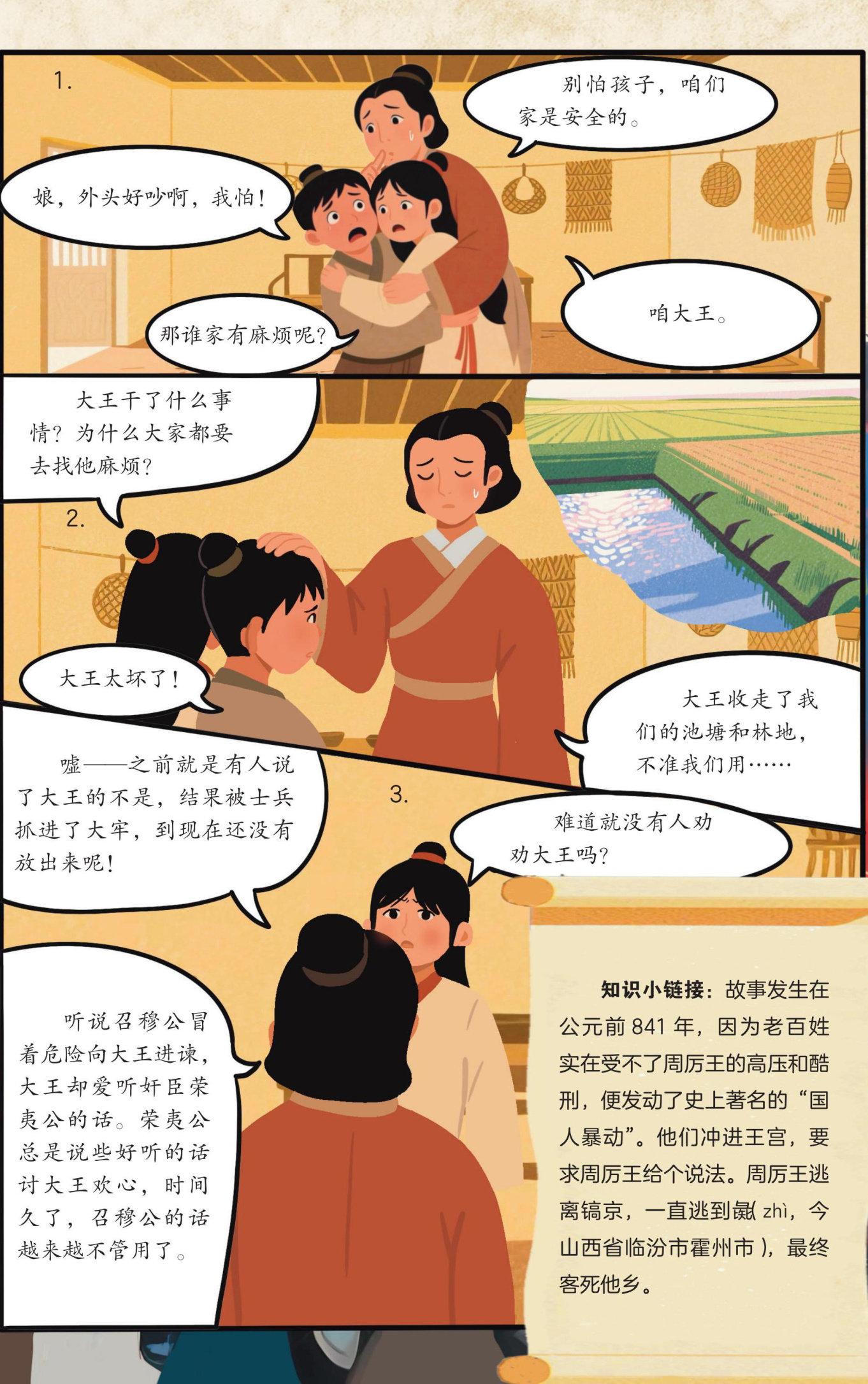 周厉王是西周第十位君主。他在位期间,不听忠臣谏言,反而宠信奸臣荣夷公。为了扩大利益,他将山林川泽等自然资源收归王室所有,不许老百姓以此谋生。平民断了生路,自然会有议论和咒骂。但是,周厉王不但不思悔改,反而重罚议论此事的人。最后,百姓都不敢说话,诸侯也不再朝拜。