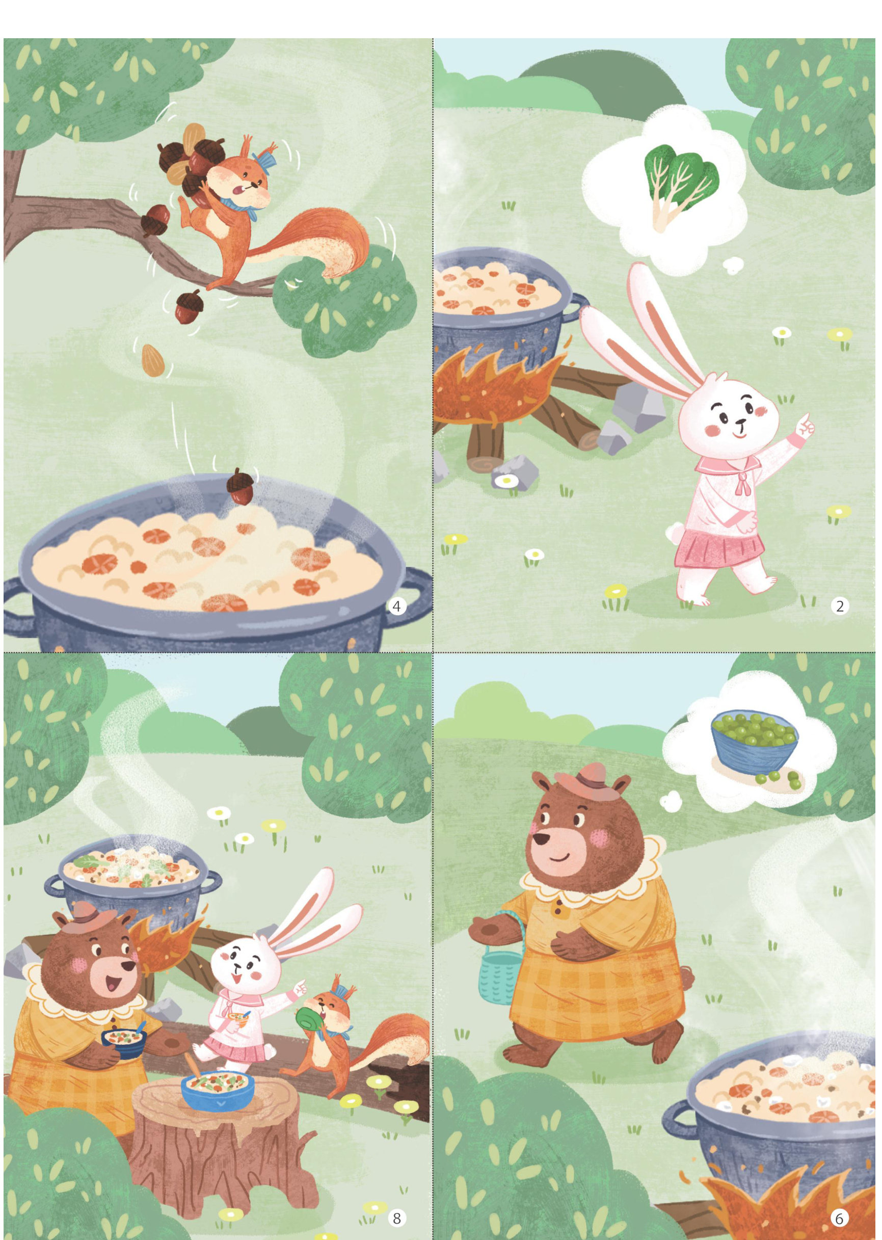 原来,树上的松鼠先生正在采集坚果,有几颗坚果掉进了汤里。他不禁担心起来:“兔子小姐会生气吗?”