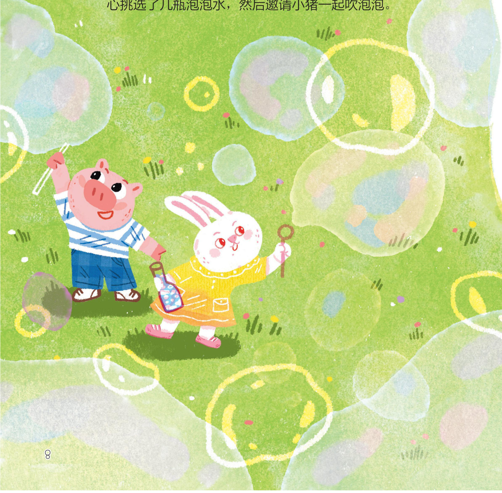 一个阳光灿烂的下午,小兔在大熊的杂货铺里精心挑选了几瓶泡泡水,然后邀请小猪一起吹泡泡。