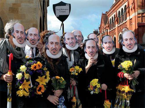 2016年4月23日,在英国埃文河畔斯特拉特福,人们头戴莎士比亚的面具参加纪念活动。 韩岩 摄