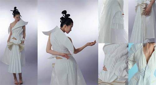 《折隙生白》的设计灵感来源于折纸艺术中独特的折叠技法与富有空间感的立体结构,不仅赋予服装独特的形式美感,更增强了服装廓形的塑造能力。在当今社会,时尚行业以极快的节奏推动创新发展,而个性化与自由表达成为重要趋势之一,折纸艺术的特性恰好与这一趋势相契合,以其灵活的造型能力突破传统女装的造型局限。在廓形上以X形和O形为主,在色彩运用方面,以代表简约、纯净、空灵的白色作为主色调,并辅以柔和的米色,旨在呼应折纸材料的原始质感,同时赋予服装更为自然与本真的视觉效果。(剩余376字)
