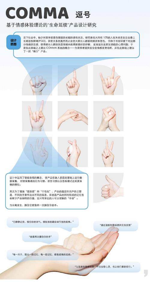 “COMMA”一词既有“逗号”的含义,又代表“银纹多角蛱蝶”,寓意生命之不息。产品基于情感体验理论,旨在通过数字化技术维系生者与逝者的情感联结,缓解丧亲悲伤与死亡焦虑。设计以“记忆复现”与“情感在场”为核心,构建动态交互系统,涵盖哀伤疗愈、代际记忆传承与生前规划。采用磁悬浮技术营造仪式感,造型由用户手捏而成,在创造产品的同时形成的记忆也会赋予产品独特的价值,是只有亲近的人可以理解的“手语”——“当分离发生,握住它就像再一次握住你的手。(剩余406字)