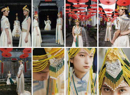本系列由畲族公主婚礼服、小礼服与休闲礼服组成。凤凰元素为主但装饰面积递减,即整个系列重点突出,层次分明,有简有繁,同时匹配从“隆重——次重要——日常”3 个不同场景的使用。本设计融汉唐公主礼服与畲族三公主鳯凰装形象于一体,取汉服、云肩、倒宽袖与现代婚礼服的多层大裙摆造型相结合,并保留景宁畲族服饰典型样式符号中的立领、“厂字服斗”、凤凰头冠、蔽膝、风凰图案等元素;以皇家宫廷富丽(米白与金色)为主调,突破以往传统大红大紫的艳色系;采取非遗手工之盘金绣刺绣立体花卉和金凤凰。(剩余108字)