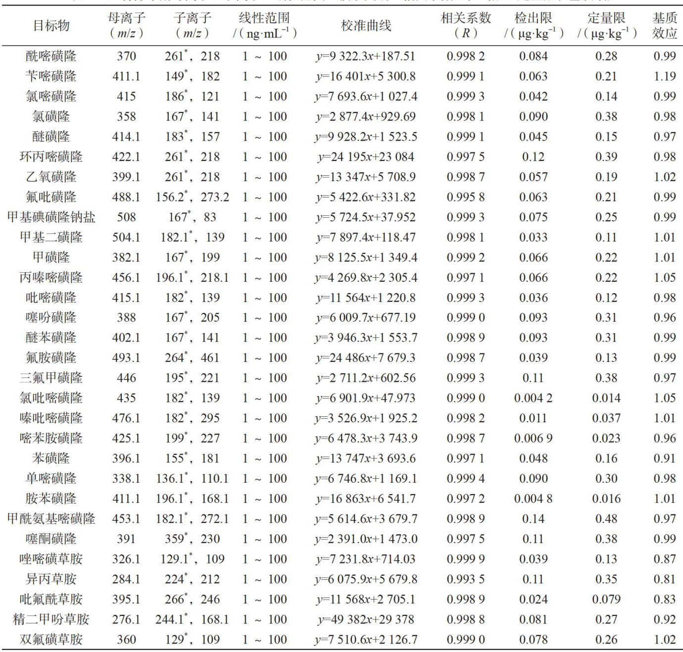 Abstract: Objective: To develop a rapid method for the simultaneous determination of 49 sulfonylurea and amide herbicides residues in rice byoptimizing the QuEChERS method combined with Ultra-Performance Liquid Chromatography-Tandem Mass Spectrometry (UPLC-MS-MS). Method: The sample was extracted by acidified ACN, purified by modified QuEChERS method and simultaneously determined by UPLC-MS-MS equipped with electric spray ion source.The matrix curve was quantified by extermal standard method.Result: The linear relationship of 49 herbicides was good within the range of 1ng⋅mL-1 to 100ng⋅mL-1 ,with a correlation coefficient (R) of 0.993 5 to 0.999 9, a limit of detection of 0.003μg⋅kg-1 to 0.160μg⋅kg-1 ,a limit of quantification of 0.010μg⋅kg-1 to 0.540μg⋅kg-1 , an average recovery rate of 62.7% to 109.1% ,and a relative standard deviation of 0.6% to 9.9% Conclusion: This method issensitive,accurate,and stable,and can meet the detection requirements for 49 types of sulfonylurea and amide herbicides residuesin rice.
