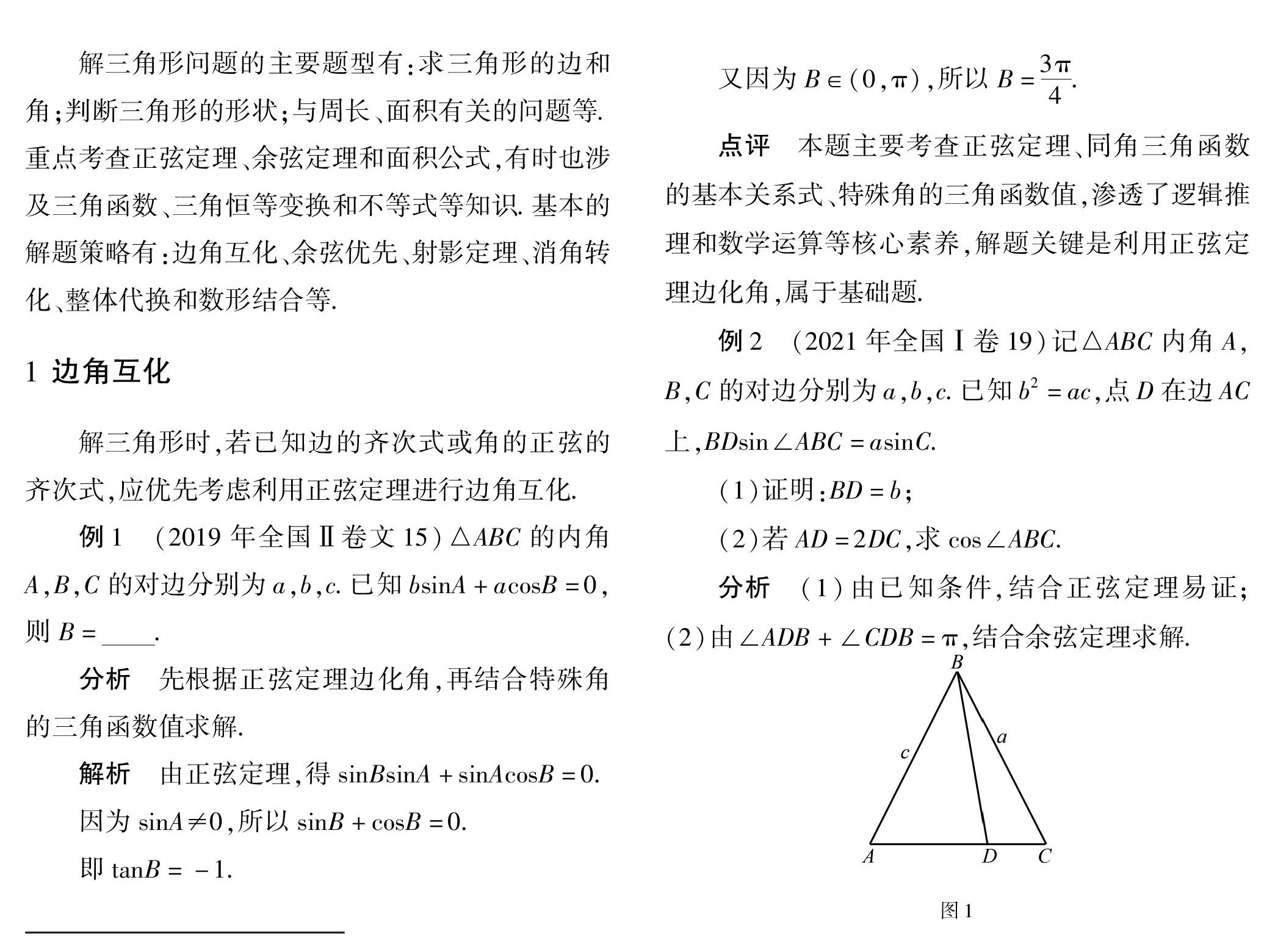 摘 要:解三角形是高中数学的重要内容,也是高考必考的知识点.考题灵活多样,多以选择题、填空题或解答题的形式出现.难度虽然不大,但由于部分同学思路不清、方向不明,导致得分率不高.本文对近几年的高考真题进行了梳理,归纳出一些基本的解题策略,供大家教学时参考.