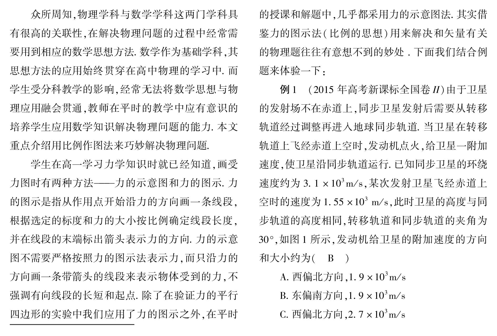 摘 要:高中学生普遍觉得物理不好学,除了阅读审题、物理建模科学思维等方面的困难之外,有时候是明明已经读懂题意,也建立了物理模型,但却在数学计算上出现了拦路虎.如果能灵活应用比例作图法将可以避开复杂的数学运算,更直观快速的得到答案.