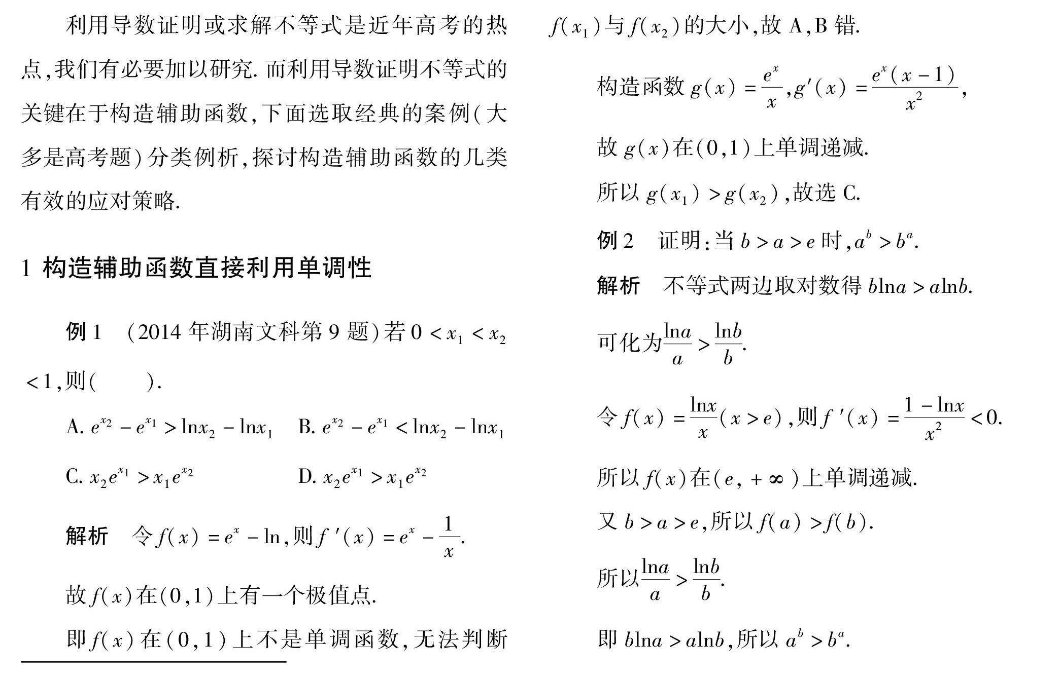 摘 要:一些不等式的证明,若能立足函数的角度,利用导数研究函数的性质(单调性或最值极值)来加以证明,就显得很有优越性.而这一思想的关键在于构造合理的辅助函数.本文精选高考经典题,以案例的形式加以分类例析,并给出了应对策略.