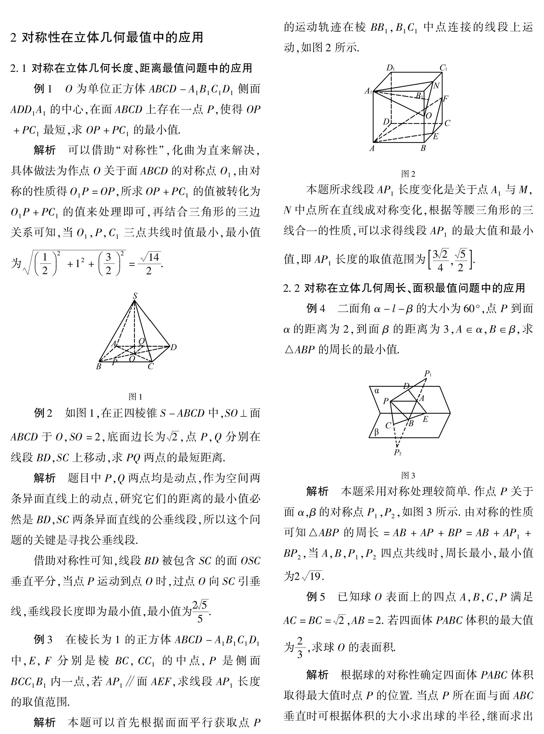 摘 要:最值作为高中教学的一个重要内容,在考查时常与其他知识点结合,解题策略多样,所以学生在学习中感觉最值问题比较复杂.本文针对立体几何部分内容,考虑到空间几何体的结构特征,所以选择了对称性来研究,希望借此提升学生最值学习效果.