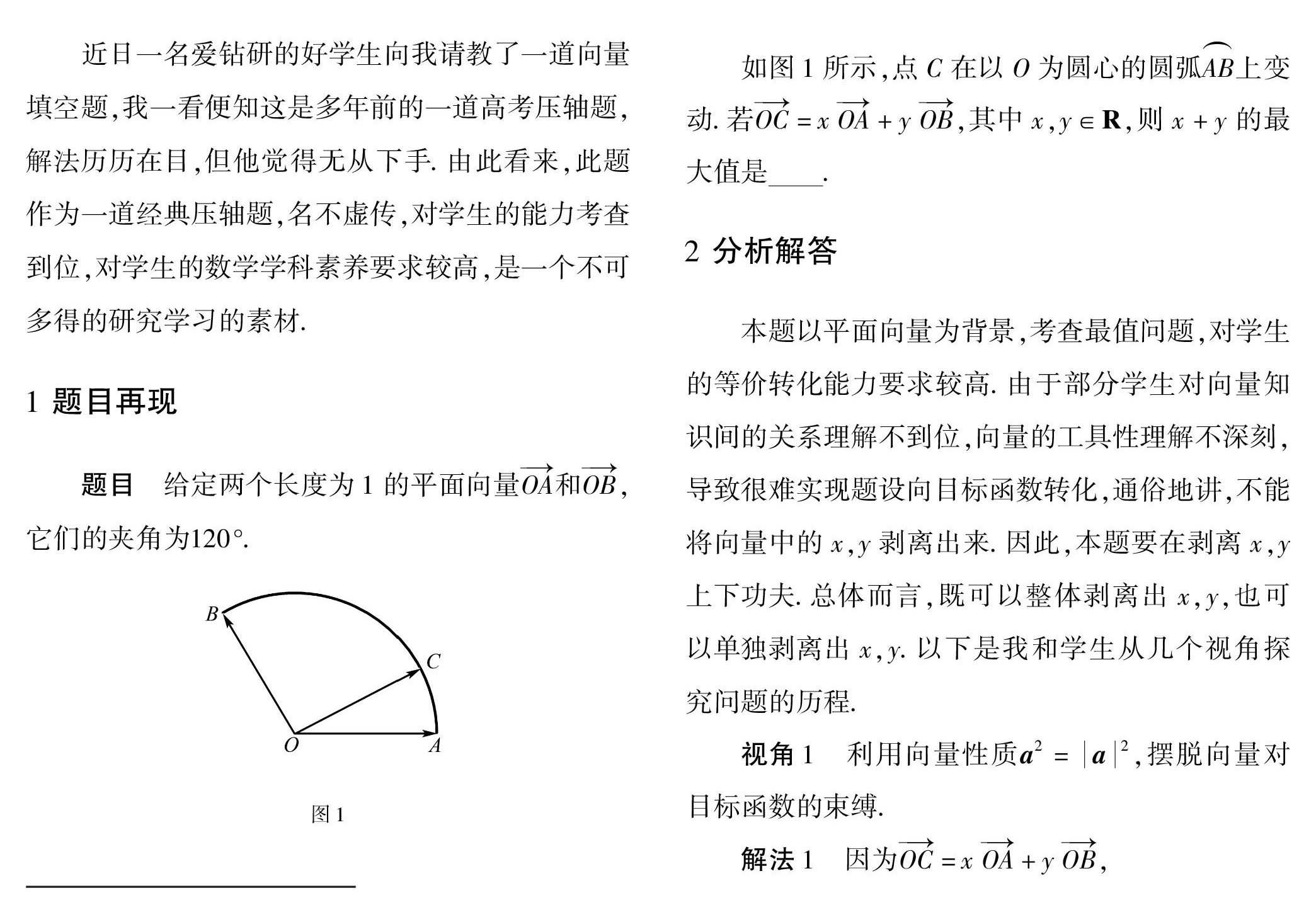 摘 要:平面向量作为高中数学的重要工具,它将代数和几何紧密联系起来.有关向量的试题可以从代数和几何两个角度思考,再辅以数学思想方法才能突破难题,仅在纯向量知识间思考问题,难以奏效.