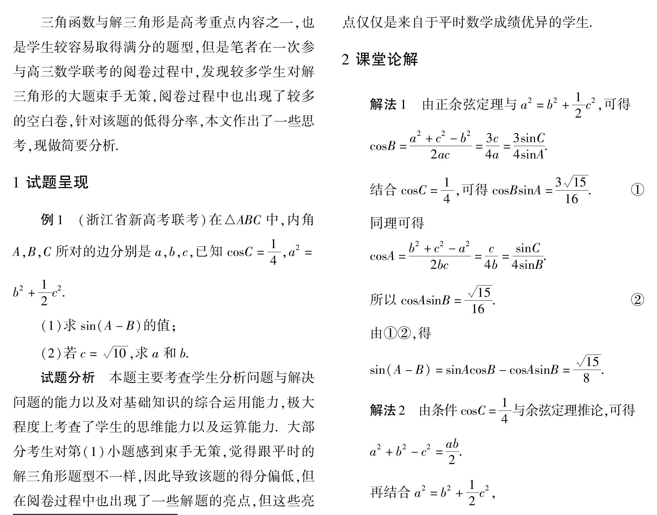 关键词:三角函数;正余弦定理;数学思维;新高考