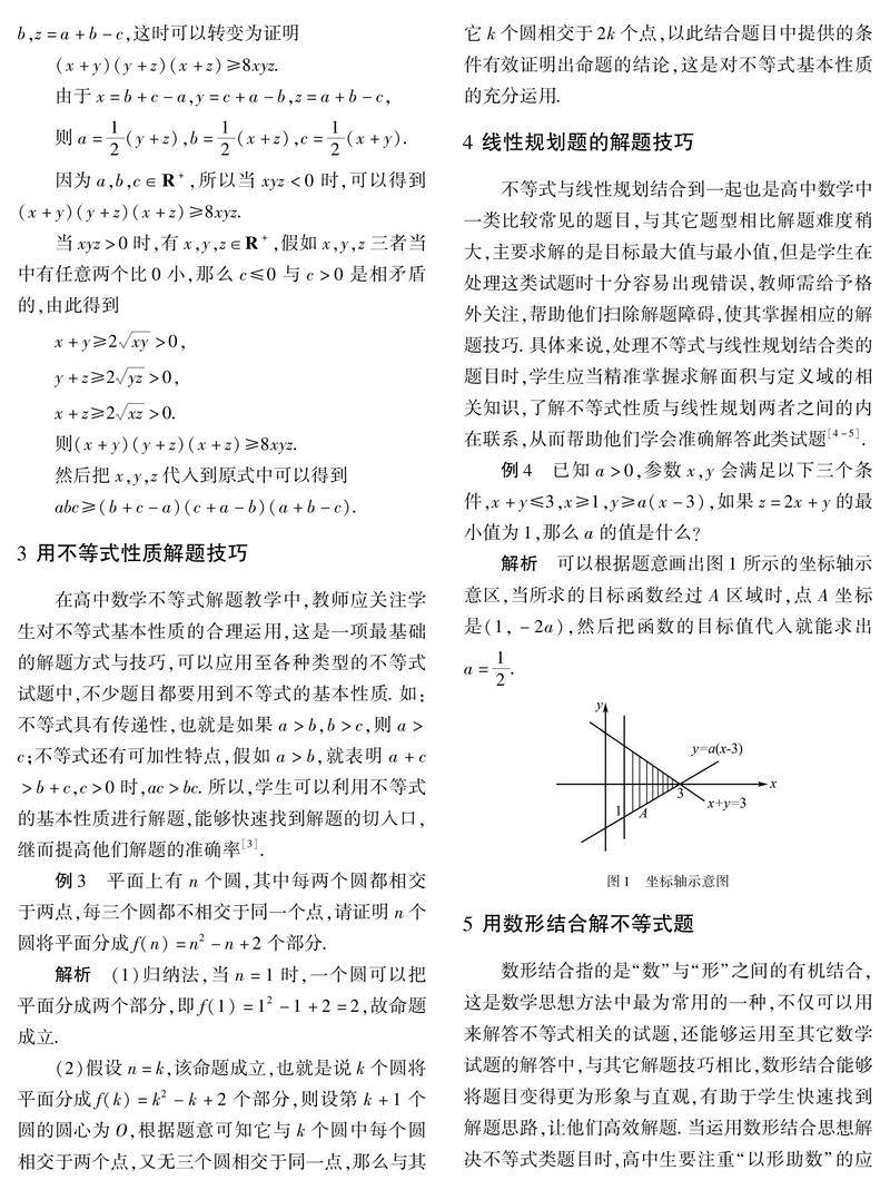 摘 要:不等式知识应用范围广,涉及到的题型更是复杂多变,文章通过举例详细剖析了不等式的反证解题技巧、不等式的换元解题技巧、不等式的性质解题技巧和线性规划题的解题技巧等.