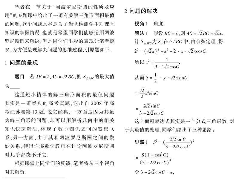 摘 要:文章通过介绍2008年高考江苏卷第13题的多种解题思路,试图呈现解决这类解三角形最值问题的思维过程,并就如何在教学中提高学生解决问题的能力,进而提升其数学核心素养给出一点思考.