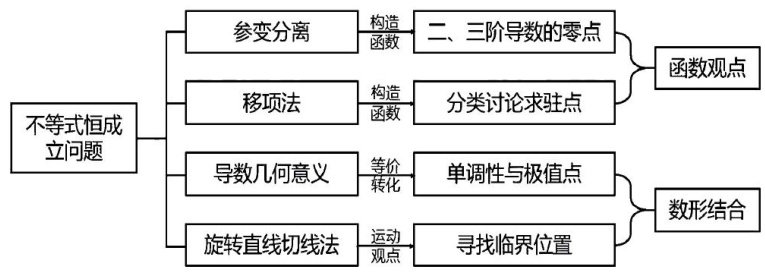 含参不等式恒成立问题是高中数学函数主线的重难点内容之一,蕴含函数观点、等价转化、数形结合、分类讨论和变量观等数学思想.教学实践中,学生往往首选参变分离法进行等价转化,通过求函数导数来确定最值.当无法求出一阶导的驻点时,部分学生会尝试二阶导、三阶导甚至四阶导,却可(剩余3982字)