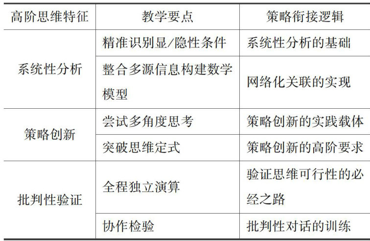 高阶思维在数学解题中的表现有以下几点:一是系统性分析,即能穿透题目表层条件,建立条件间的网络化关联;二是策略创新,即能突破模板化解法,根据目标特征自主设计解题路径;三是批判性验证,即能对解题过程进行动态监控,及时修正偏差.对此,教师需结合高阶思维的特点梳理解题教(剩余6020字)
