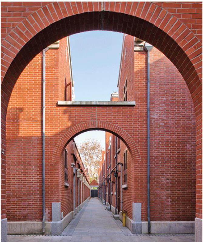 走在弄堂里,两侧醒目的清水红砖墙中嵌有双开的、黑漆漆的铜环木门,门对门、户挨户,门的边框是巴掌宽的水泥石料,门框上方有方形水泥雕饰门楣。弄堂半虚掩着的后门里,时常传出灶披间(厨房间)里锅子噼啪作响的声音间或飘出的阵阵饭香。前门偶见阔气的人家包租的黄包车穿梭在狭窄的弄堂小路里,“奥斯汀”和“雪弗莱”是如何也开不进去的,只好在总弄广场回旋调转,那里是炫耀主人气派的适宜场所……